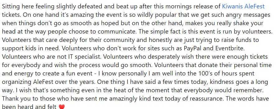 This is a volunteer-run, volunteer-organized event (disclosure: There is none, I don’t know any of the people involved). And while I’m sure it is great to have it grow into something so successful, having something you do in your spare time grow into a massive success is, ironically, a terribly stressful experience. Anyone who has started administrating a wildly successful Facebook group will tell you the same thing — you do a good enough job that people start to think of what you’re doing as a professional space and start placing professional expectations on you, like the ability to respond 24/7, or to come up with a set of rules that will please everyone — all while you’re trying to do your normal job and maybe take a weekend off once in a while. Taking it back into the realm of ticket-selling — are you aware of anyone having a good ticket-buying experience for an event for an event that attracts more attendees than there are spaces available? I’m not, which is why headlines about Ticketmaster effing up are so prevalent. Even if everything runs as smoothly as possible, people are going to be left upset about not being able to get them — and some of those people are going to lash out. I saw this post from one of the volunteers involved with AleFest and this is not how someone should be feeling about helping create one of the most highly-anticipated local events of the year: