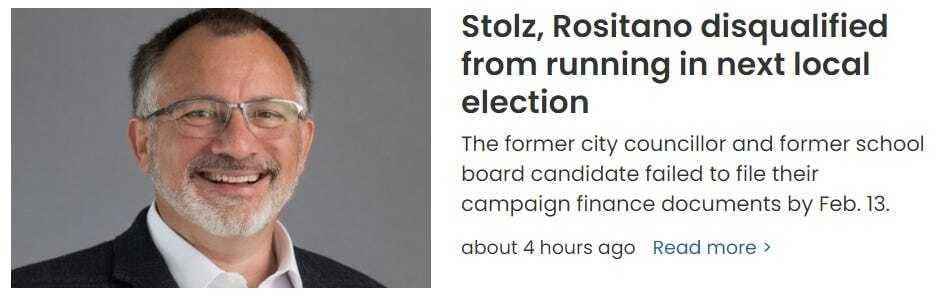It’s almost as if knowing that he had failed to file on time and would therefore be disqualified from running in the next election, Stolz decided to get out ahead of things by saying he didn’t want to run, anyways. Which — maybe he didn’t. So this should be a relief to him, and to anyone who thinks someone who wants to help run a city should be able to file papers on time. Hope he enjoys his freedom.